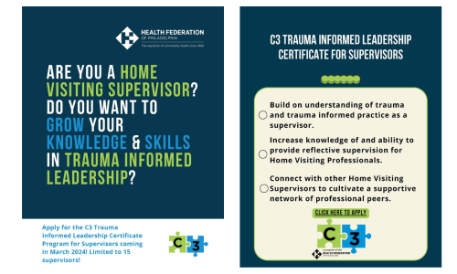 Are you trying to build your skills as a supervisor and leader? Come join C3 for a 12-month supervisory certificate program to build your understanding of trauma and trauma informed practice, increase your knowledge of and ability to provide reflective supervision, and connect with other Home Visiting Supervisors to cultivate a supportive network of professional peers.